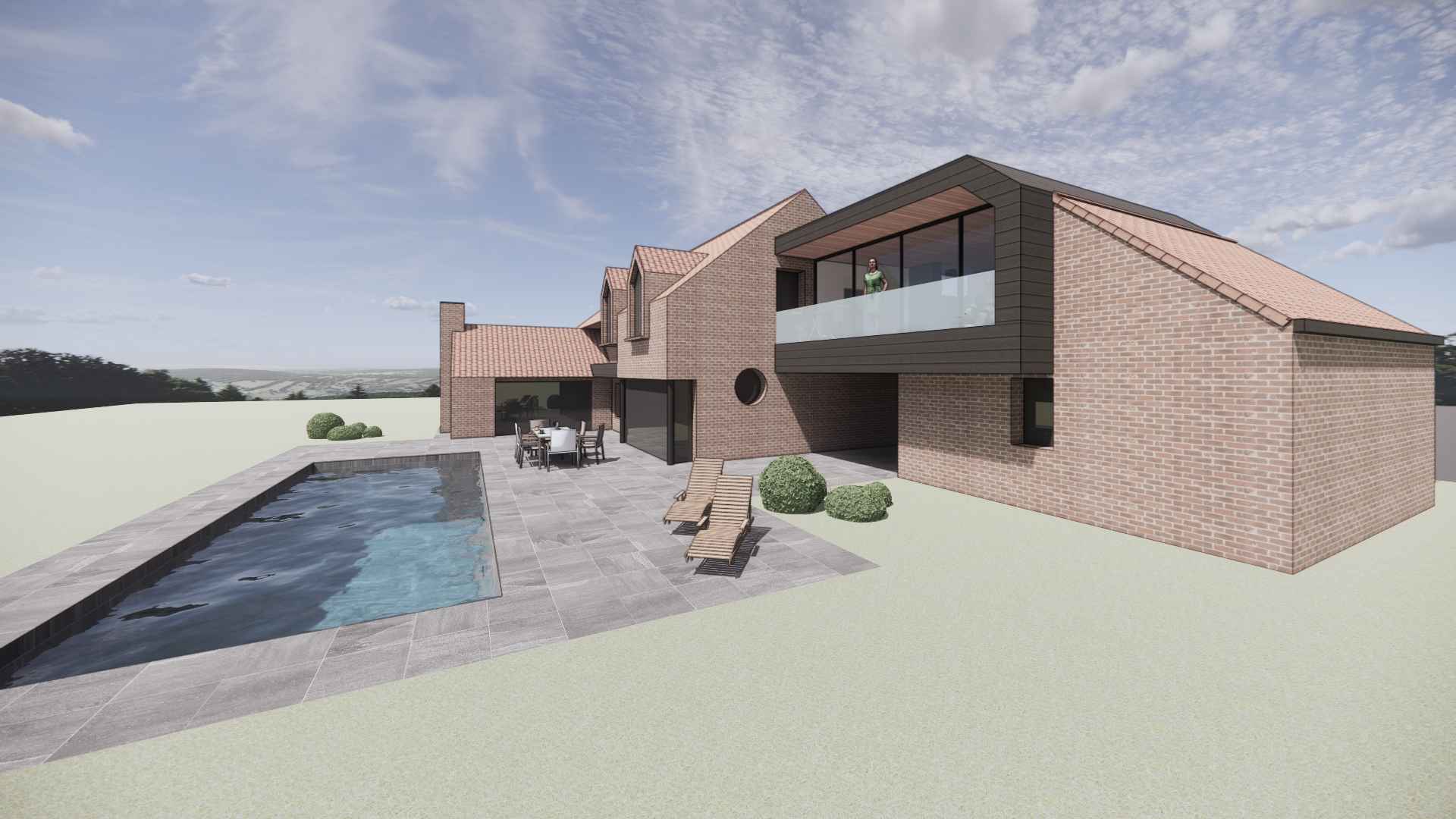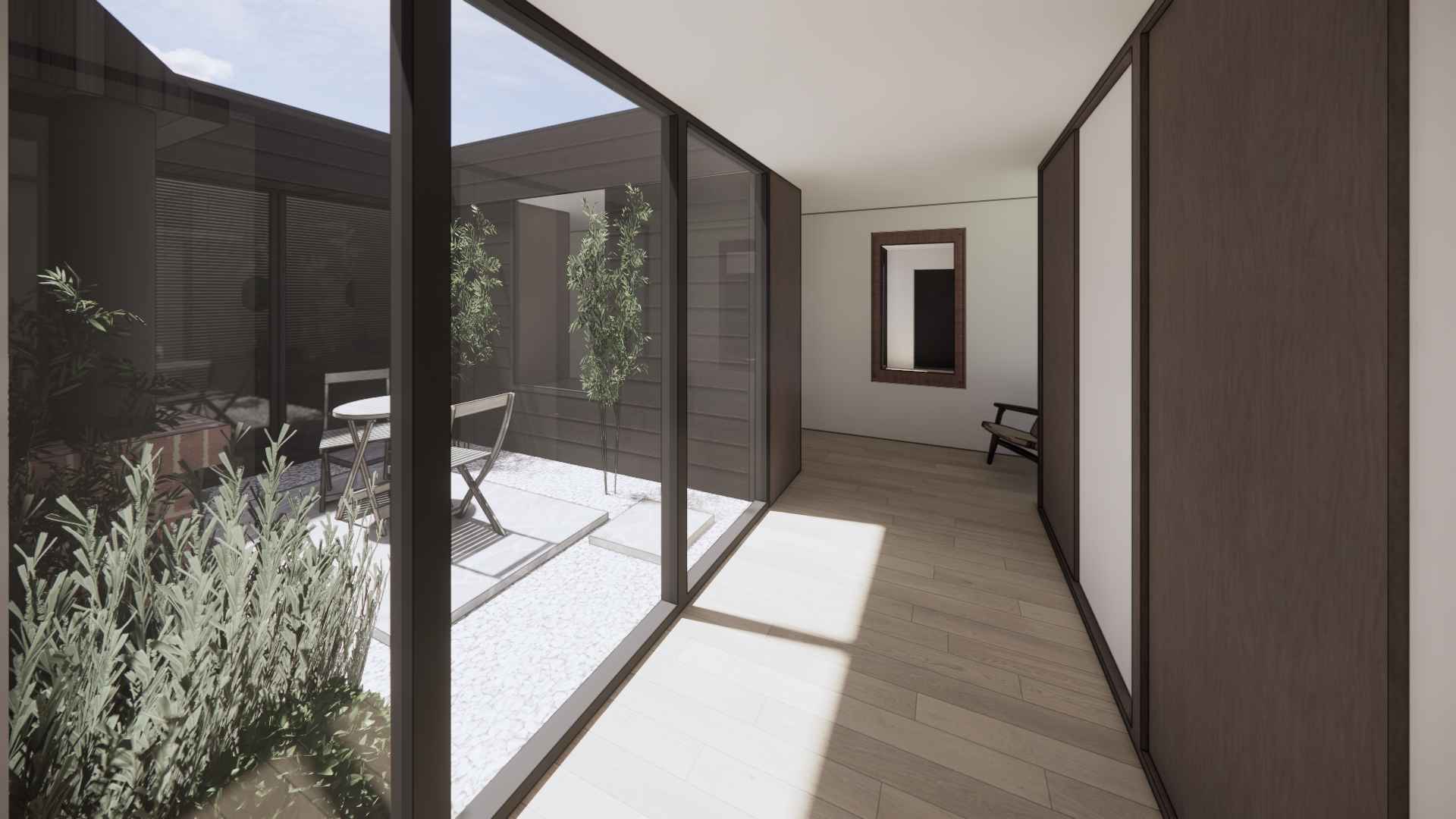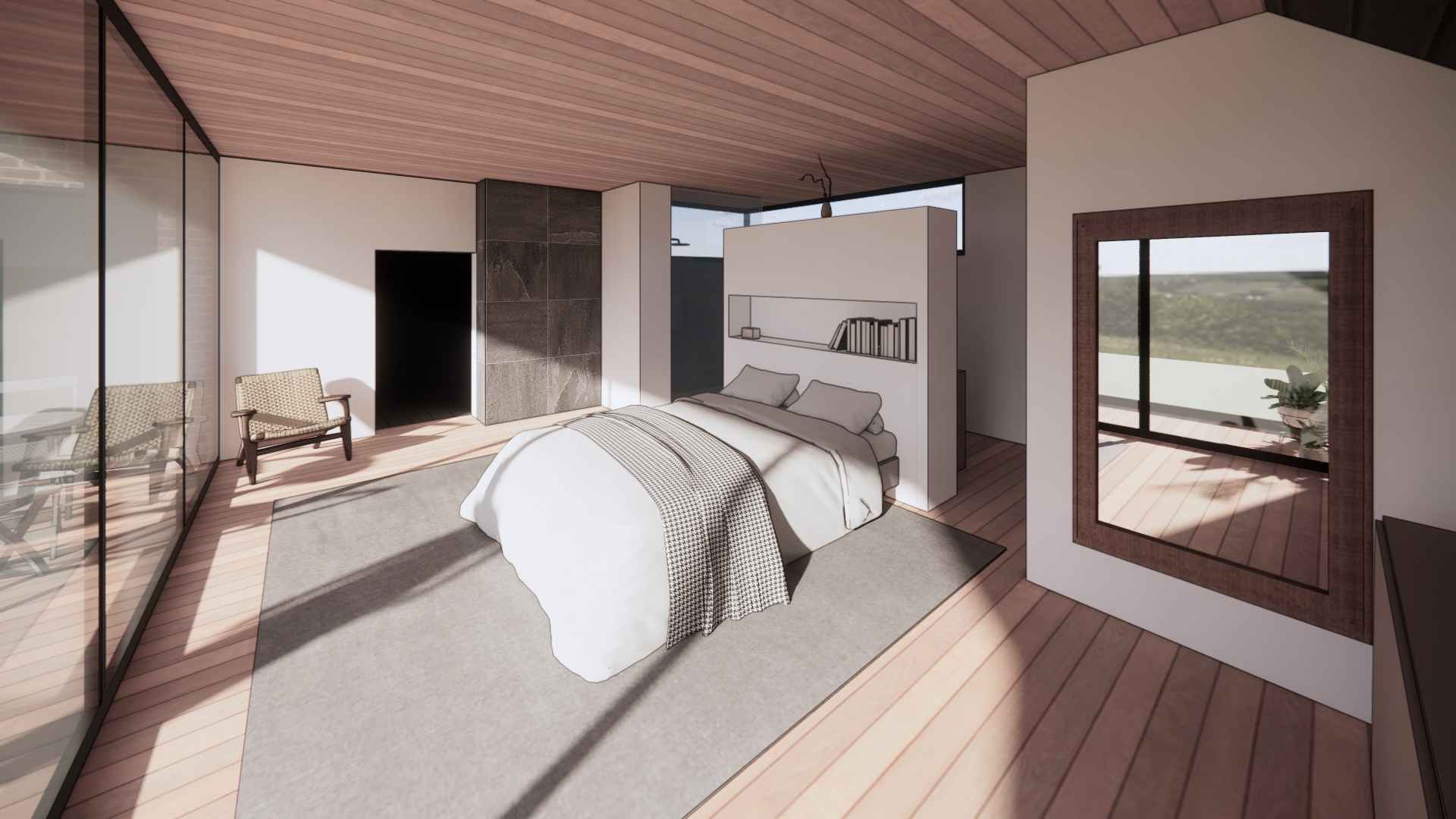 Le projet de création d’une suite parentale sur cette grande maison a donné lieu à deux partis-pris totalement opposés. Le premier choix possible consiste à rejoindre le garage par un volume à l’étage. Cela permet d’abord de recréer un ensemble cohérent et continue d’un bord à l’autre de la parcelle. De plus, la couverture ainsi créée vient protéger un espace de stationnement extérieur entre les deux volumes existants. La suite gagne aussi en intimité et d’un rapport privilégié à la piscine côté jardin grâce à un balcon exposé au sud. L’aménagement intérieur se veut le plus ouvert possible afin de ressentir l’unité de ce volume épuré en zinc noir posé entre les deux constructions en maçonnerie. Le second choix consiste quant à lui à rester au rez-de-chaussée et de venir combler l’espace entre l’habitation et la limite de propriété. Ce volume, plus discret que le précédent permet de conserver l’allure originale de l’habitation. Un espace de dressing en couloir va venir s’articuler autour d’un patio afin de desservir la salle de bain et la chambre. Cela permet de mettre une distance entre les espaces de vie et la chambre. En créant un nouvel extérieur intimiste, le patio va offrir de la lumière à l’espace de vie maintenant l’ouverture existante. Ainsi, la chambre récupère un accès direct à la terrasse et à la piscine.