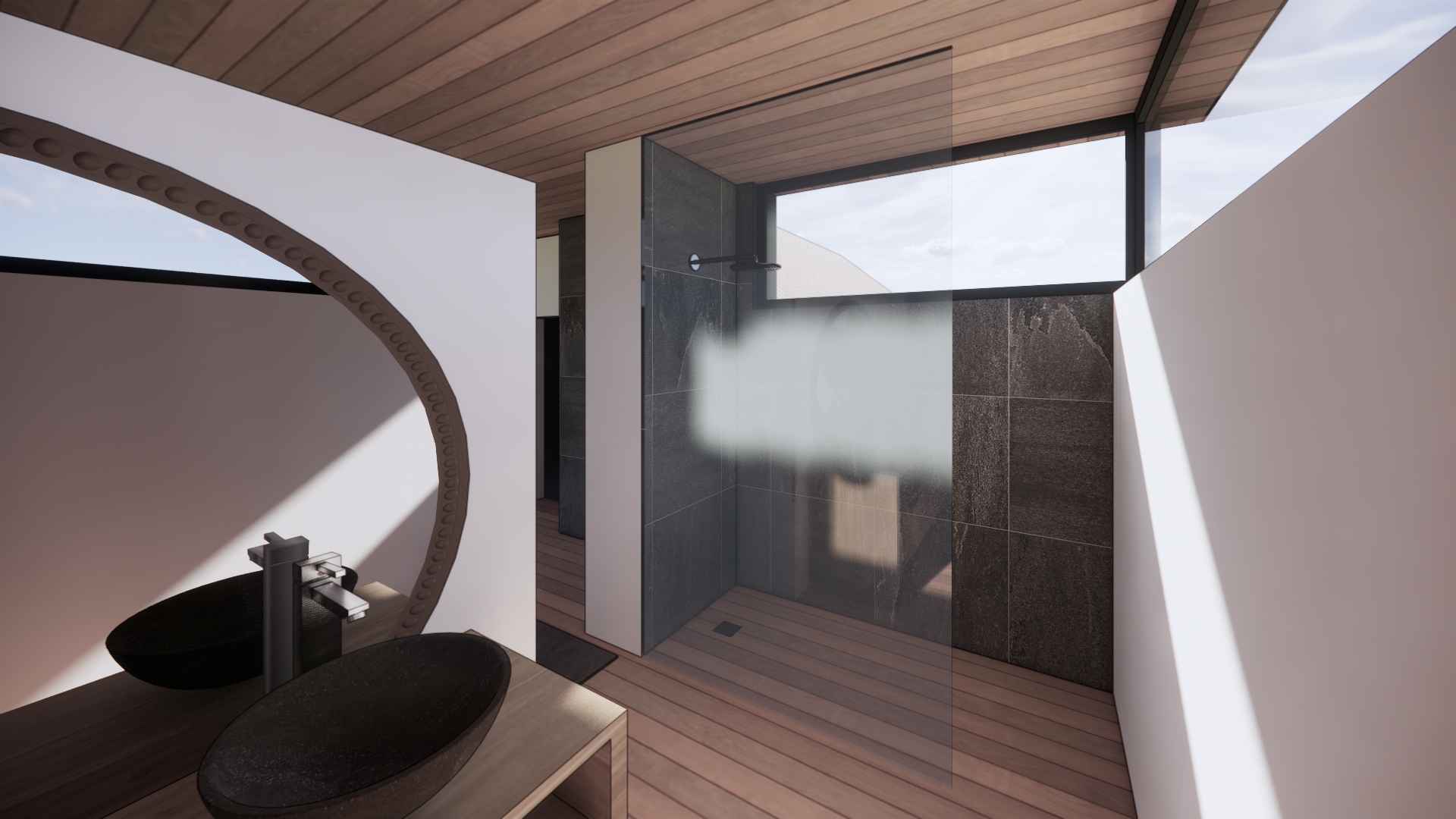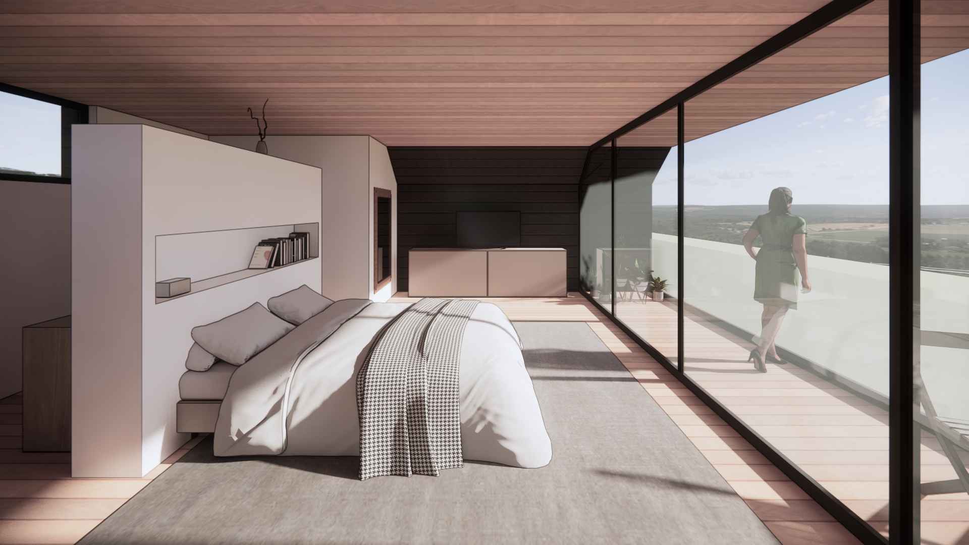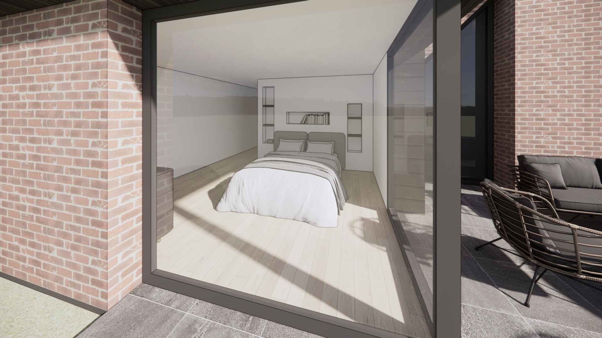 Le projet de création d’une suite parentale sur cette grande maison a donné lieu à deux partis-pris totalement opposés. Le premier choix possible consiste à rejoindre le garage par un volume à l’étage. Cela permet d’abord de recréer un ensemble cohérent et continue d’un bord à l’autre de la parcelle. De plus, la couverture ainsi créée vient protéger un espace de stationnement extérieur entre les deux volumes existants. La suite gagne aussi en intimité et d’un rapport privilégié à la piscine côté jardin grâce à un balcon exposé au sud. L’aménagement intérieur se veut le plus ouvert possible afin de ressentir l’unité de ce volume épuré en zinc noir posé entre les deux constructions en maçonnerie. Le second choix consiste quant à lui à rester au rez-de-chaussée et de venir combler l’espace entre l’habitation et la limite de propriété. Ce volume, plus discret que le précédent permet de conserver l’allure originale de l’habitation. Un espace de dressing en couloir va venir s’articuler autour d’un patio afin de desservir la salle de bain et la chambre. Cela permet de mettre une distance entre les espaces de vie et la chambre. En créant un nouvel extérieur intimiste, le patio va offrir de la lumière à l’espace de vie maintenant l’ouverture existante. Ainsi, la chambre récupère un accès direct à la terrasse et à la piscine.