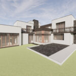 Cette grande demeure individuelle est un éloge au mouvement art déco des années 1930. Autour d’un escalier central, se déroulent une grande pièce de vie, une cuisine fonctionnelle donnant sur une cour intérieure et un coin repas informel. À cela, s’ajoutent un double garage et un bureau donnant sur la rue. À l’étage, on retrouve une suite parentale ainsi que trois chambres. Les espaces extérieurs sont travaillés de sorte à ancrer la construction sur le terrain par un jeu de murets et de terrasses. Cet ensemble est complété par une grande piscine extérieure faisant dialoguer l’architecture et le jardin arrière.